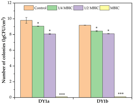 Effects of linalool on viable counts of living bacteria in the pellicle of B. amyloliquefaciens DY1a and DY1b. One-way ANOVA followed by Dunnett’s multiple comparison post hoc test was carried out to determine statistical significance between each treatment and the negative control of the same strain; * p < 0.05, *** p < 0.001.