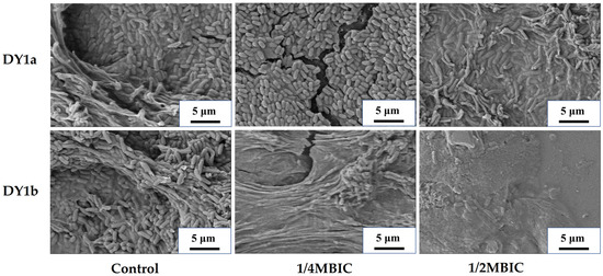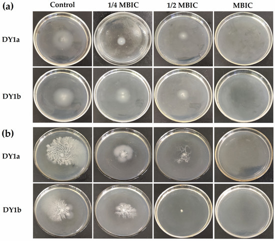 Figure 1 depicts pellicle biofilm formation at varied linalool concentrations. From the data in Figure 1a, the MBIC values of linalool on B. amyloliquefaciens DY1a and DY1b were 4 μL/mL and 8 μL/mL, respectively. After 48 h of culturing, no visible pellicle biofilm was produced with a linalool concentration of 1 MBIC. In comparison to the pellicle biofilm that formed on the air–liquid surface in the absence of linalool, which was much denser and more robust and had more wrinkles, the topography of the pellicle biofilm formed at linalool concentrations of 1/4 MBIC and 1/2 MBIC appeared to be looser and more homogeneous and have a less rough surface.