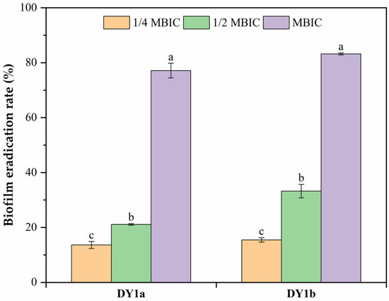 Eradication effects of linalool on preformed pellicle biofilm of B. amyloliquefaciens DY1a and DY1b. One-way ANOVA followed by Dunnett’s multiple comparison post hoc test was carried out to determine statistical significance among treatments of the same strain; different lowercase letters above columns of the same strain indicate differences at p < 0.05.