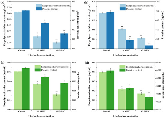 Effects of linalool on exopolysaccharide and protein contents in pellicle matrix (a,b) and culture medium (c,d). (a,c) DY1a; (b,d) DY1b. One-way ANOVA followed by Dunnett’s multiple comparison post hoc test was carried out to determine statistical significance between each treatment and the negative control of the same strain; * p < 0.05, ** p < 0.01, *** p < 0.01.