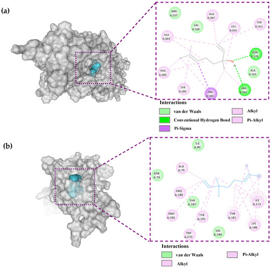 QS plays an essential role in regulating the formation and development of bacterial biofilms. The ComQXPA quorum sensing system, a conserved QS system in the genus Bacillus, is involved in a variety of physiological processes, including extracellular matrix production, which is required for the formation of pellicle biofilms [33]. ComP, a two-component sensor histidine kinase in the ComP-ComA system, acts as an essential receptor in the reception of QS signaling molecules [34]. As shown in Figure 8a, the structure of linalool complexed with ComP was used in a docking study, and the results showed that linalool effectively binds to subsite I of the ComP binding site with binding energies of −6.4 kcal/mol. Hydrogen bonds were formed between Asn179, a H-bond donor, and the oxygen atom in the hydroxyl group of linalool. Another hydrogen bond was formed between the hydrogen atom of the hydroxyl group in linalool and Ala161, a H-bond receptor. Linalool could bind to the active site of ComP via hydrophobic interactions with residues Ala307, Ala303, Leu310, Tyr162, Tyr289, and Phe285, which serve to enhance the binding of ComP. Meanwhile, a pi-sigma covalent bond was formed between linalool and Phe183, as well as van der Waals forces with residues Ala 307, Arg237, and Val 168 in the docking pocket, allowing the linalool-ComP complex to remain stable.
