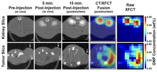 The relative clearance of the measured whole-body signal over time could be correlated to the clearance of the injected nanoparticles, reaching signals close to the background level after 8 weeks []. It must be noted here that no quantitative conclusions could be drawn from the full-body projection images since effects such as self-absorption of fluorescence photons can only be modeled from tomographic data []. Therefore, additional in vivo XFCT and CT scans were acquired in [] with the liver as the region of interest due to the major accumulation of NPs observed in that organ, which were then analyzed with an iterative XFCT reconstruction algorithm that allows for quantitative determination of NP concentrations. The detection limit of the imaging system was estimated at 0.05 mg/mL of Mo, but it is noted in [] that this limit can be linearly improved with an increased pixel exposure time which, however, implies a higher radiation dose and longer scan times. A drawback of this achievement is that no heavier elements than Mo can be imaged due to the current limitation in photon energy of the liquid metal jet source used.