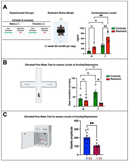 Biochemical and behavioral effects of restraint stress on male and female mice. (A) Table showing the experimental groups and schematic representation of the restraint (R) model. Each mouse was placed on the plastic platform, and their upper body and limbs were restrained with double-sided adhesive Velcro tape (Scotch fasteners). The tail was also restrained using nonadhesive medical tape. The head was left unrestrained. Corticosterone was measured. Average corticosterone plasma levels in controls and restraint male (M) and female (F) mice (B) Schematic representation of the elevated plus maze. Each mouse was placed on the central platform and allowed to explore the maze for 5 min. Average values for the time in the open arms/time out in seconds after the stress challenge in controls and restraint male and female mice. Individual values for each group are represented as a circle (ο) for males and as a square (■) for females. Controls (green bars) and restraint (red bars). (C) Startle response test. Controls and restraint male (M) and female (F) mice were subjected to the prepulse inhibition experimental protocol. Startle amplitudes were detected and measured by a piezoelectric accelerometer mounted directly below the animal’s midline on the Plexiglas frame’s underside. Representation of the average values of the startle amplitude (maximum motion index) for restraint (R) males (blue bars with squares) and restraint (R) females (purple bars with squares). Data represent the mean ± S.E. n = 4–8 independent samples per group. * p < 0.05, ** p < 0.01, ns = not significant. A two-way ANOVA with Tukey’s multiple comparisons analysis was used to evaluate differences among group treatments unless otherwise specified.