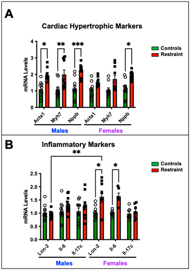 β-myosin heavy chain (myh7), skeletal muscle α-actin (Acta1), and brain natriuretic peptide (Nppb) are predominantly expressed in the heart during embryonic and fetal stages, with their expression significantly reduced in ventricles after birth. However, in pathological cardiac hypertrophy, the expression of these genes is markedly upregulated. Previous studies have indicated that imbalances in glucocorticoid signaling in cardiomyocytes are associated with the expression of these markers. Furthermore, their expression shows sexual dimorphism, with higher levels observed in male hearts compared to female hearts. Consistent with these findings, our restraint model exhibited statistically significant increases in myh7, Acta1, and Nppb expression in restraint male hearts compared to their non-stressed (controls) counterparts. However, in restraint female hearts, only Nppb showed a significant elevation. Restraint female hearts displayed more pronounced and significant changes in the expressions of Il-6, and Lcn-2 (Figure 2). Il-6 plays a central role in heart failure (HF) pathophysiology. A recent clinical study showed that elevated Il-6 levels are found in more than 50% of HF patients with a poor prognosis [29]. Increased expression of Lcn-2 in the heart has been associated with cardiomyocyte apoptosis and the development of pathological cardiac hypertrophy and progression to HF [30]. Published data suggest that glucocorticoid receptors regulate Lcn2 expression in cardiomyocytes, and alterations in its expression are implicated in the progression to pathological cardiac hypertrophy. In our study, we observed significant upregulation of Il-6 and Lcn2 expression in restraint female hearts compared to their controls, following restraint stress. These findings indicate that stress may induce cardiac pathology by triggering sex-specific gene expression patterns in the heart.
