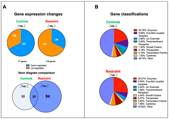 Pattern of gene expression between male and female hearts from controls and restraint mice. (A) Analysis of the microarray results showing significantly altered genes in each comparison: control male (♂) to control female (♀) (77 genes) and restraint male to restraint female (119 genes). Orange indicates high-expressing genes, whereas blue indicates low-expressing genes. Venn diagram of the results overlaying controls (males vs. females) and restraint (males vs. females) animals. Only 25 genes are common between control and restraint hearts (intersection). Stress activated the expression of 94 sexually dimorphic genes and abolished the sexually dimorphic expression of 52 genes. (B) Gene classifications of the differentially expressed genes. Most sexually dimorphic expressed genes are enzymes and G-protein coupled receptors.