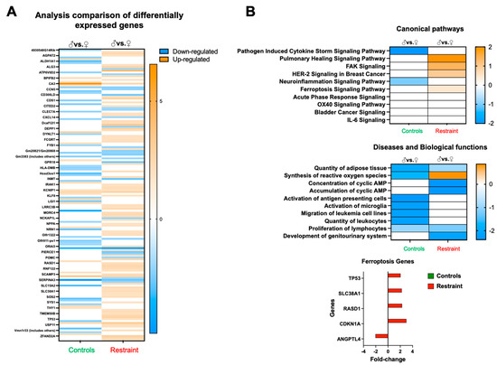 Restraint stress alters gene expression in canonical signaling pathways and other biological functions. (A) Heatmap of the microarray data displaying differentially expressed genes between controls and restraint hearts. Orange indicates high-expressing genes, whereas blue indicates low-expressing genes. (B) Pathway analysis of the differentially expressed genes. Stress leads to the upregulation of genes involved in a cytokine storm, healing (pulmonary healing signaling pathway), cell migration and growth (FAK signaling and HER-2 [breast cancer] signaling in cancer), neuroinflammation-related genes, and ferroptosis. Genes involved in ferroptosis include tumor protein p53 (p53), solute carrier family 38 member 1 (Slc38A1), dexamethasone-induced Ras related 1 (RasD1), cyclin-dependent kinase inhibitor 1A (Cdkn1A or p21) and angiopoietin-like 4 (Angptl4). Red indicates fold-change in restraint hearts (M vs. F) and green indicates fold-change in control hearts. Pathway and network analyses of the significant genes were conducted using the Ingenuity Pathway Analysis tool (Ingenuity Systems, Redwood City, CA, USA).