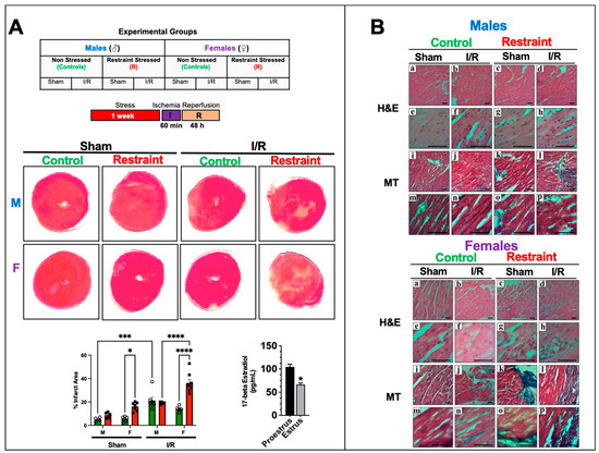 Stress effects on infarct injury after ischemia/reperfusion injury. (A) Table showing the experimental groups. Controls and restraint (R) male (M) and female (F) mice were subjected to 60 min of ischemia (I) and 48 h of reperfusion (R) following one week of restraint stress. Representative photographs of triphenyltetrazolium chloride (TTC)-treated heart sections harvested from the sham and ischemia/reperfusion (I/R) groups 48 h after surgery. The infarct areas (%) were quantified using ImageJ color threshold mode. All I/R experiments were performed in females in the proestrus phase of the estrus cycle (highest estrogen activity). Individual values for each group are represented as a circle (ο) for males and as a square (■) for females. Controls (green bars) and restraints (red bars). Plasma levels of 17-beta estradiol in females in proestrus A two-way ANOVA with Tukey’s multiple comparisons analysis was used to evaluate differences among group treatments unless otherwise specified. Data represent the mean ± S.E. n = 5–10 mice per group. Only statistically significant differences are shown in the figure. * p < 0.05, *** p < 0.001, **** p < 0.0001. (B) Representative micrographs of H&E (upper Panel (a–p)) and Masson’s trichrome (lower Panel (a–p)) stained hearts were harvested from controls and restrained males and females. Male and female sections were stained at different times; n = 5. The scale bar represents 50 µm.