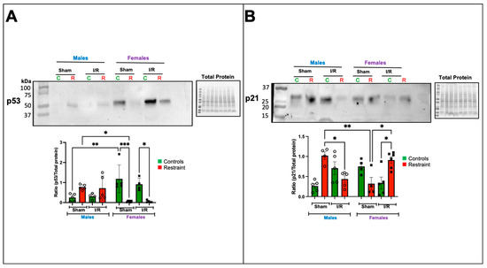 Consistent with our microarray data, p21 was significantly elevated in sham restraint male hearts compared to their female counterparts (Figure 6B). Under ischemia reperfusion conditions, p21 levels were significantly reduced in restraint male hearts compared to the corresponding sham group (Figure 6B). The opposite was noted in female hearts where under ischemia/reperfusion conditions, p21 levels in restraint females were significantly increased compared to ischemia/reperfusion controls and sham restraint females (Figure 6B).