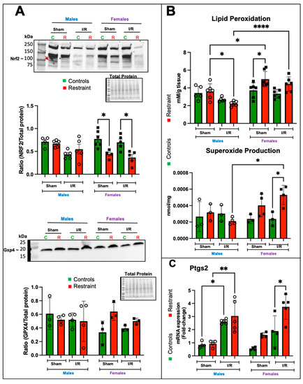 Nuclear factor erythroid 2–related factor 2 (Nrf2) is one of the central regulators of the antioxidant response [15] and a target of p53 regulation [16]. Nrf2 levels were elevated in control female hearts at baseline compared to their R counterparts and remained elevated post-I/R (Figure 7A). Restraint stress appeared to decrease the levels of Nrf2 in females under sham operated and I/R conditions, while no effects were observed in male hearts under any treatment (Figure 7A). GPX4 is a downstream effector of Nrf2 and catalyzes the reduction of hydrogen peroxide, hydroperoxides, and lipid hydroperoxides (a hallmark of ferroptosis), thereby protecting cells against oxidative damage. Although no significant changes were found in GPX4 levels, we observed a significant increase in lipid peroxidation in R-female hearts compared to their corresponding controls and male counterparts (Figure 7B). Consistent with the increase in lipid peroxidation, superoxide production was exacerbated by stress in the female heart in response to I/R (Figure 7B). Prostaglandin-endoperoxide synthase 2 (Ptgs2) is a marker for ferroptosis, and an increase in its expression correlates with lipid peroxidation. Our data showed that Ptgs2 expression was significantly upregulated in I/R in both control and R-male hearts (Figure 7C); however, in females, only the stress groups showed significant increases in Ptgs2 expression (Figure 7C).