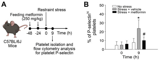 The administration of metformin in mice subjected to restraint stress rescued the up-regulation of circulating P-selectinhi platelets. (A) Experimental outline illustrating the restraint-stress mouse model and platelet analysis. (B) Flow cytometry analysis was performed to determine the percentage of platelets expressing high surface levels of P-selectin (P-selectinhi) in mice subjected to restraint stress, with or without metformin treatment at 0 and 9 h. The error bars represent the standard deviation. * p < 0.05 compared with the respective 0-h groups; # p < 0.05 compared with the respective stress + vehicle groups. The number of mice used in each group was 6 (three experiments with a total of 6 mice per group).