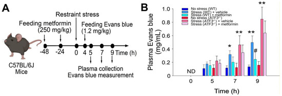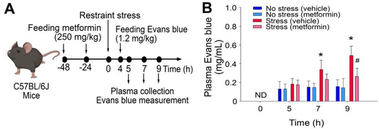 The administration of metformin effectively rescued GI leakage induced by restraint stress in mice. (A) Experimental outline depicting the restraint-stress mouse model treated with Evans blue. (B) Plasma levels of Evans blue were measured in C57BL/6J mice subjected to restraint stress, with or without metformin treatment at 0, 5, 7, and 9 h. ND: not detected. The error bars represent the standard deviation. * p < 0.05 compared with the respective no stress control groups; # p < 0.05 compared with the respective vehicle-treated control groups. The number of mice used in each group was 6 (three experiments with a total of 6 mice per group).