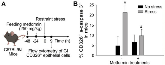 The administration of metformin effectively rescued stress-induced apoptosis of GI CD326+ epithelial cells in mice. (A) Experimental outline. (B) Flow cytometry analysis was performed on GI CD326+ epithelial cells from C57BL/6J mice subjected to 9-h restraint stress with or without metformin treatments. CD326 was used as an epithelial cell marker, and active-form caspase 3 (a-caspase 3) was used as an apoptotic cell marker. * p < 0.05 compared with the respective no-stress groups; # p < 0.05 compared with the respective control groups without metformin treatments (metformin-, vehicle controls). The number of mice used in each group was 6 (three experiments with a total of 6 mice per group).