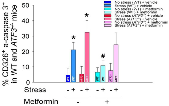 Metformin treatments rescue stress-induced apoptosis of GI CD326+ epithelial cells in mice. Flow cytometry analysis was performed on GI CD326+ epithelial cells obtained from ATF3−/− mice, with or without 9-h restraint stress and with or without metformin treatments. CD326 was used as an epithelial cell marker, while active-form caspase 3 (a-caspase 3) served as an apoptotic cell marker. Statistical analysis revealed * p < 0.05 compared with the respective no-stress groups, and # p < 0.05 compared with the respective control groups without metformin treatments (vehicle controls). The total number of mice used in each group was 6 (three experiments with a total of 6 mice per group).