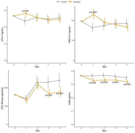 However, analysing the trajectories over time, levels of the biomarkers of bone remodelling (CTX-I and PRO-C1) increased significantly in patients treated with nitisinone compared to controls after one year of treatment (19% (95% CI [5%, 36%]) and 40% (95% CI [19%, 65%]), respectively), returning to levels like the control group at later time points (Figure 1). The same trajectory was observed for ALP (Figure S1). On the contrary, levels of the biomarkers of cartilage remodelling (CTX-II/Creat and C2M) decreased in patients treated with nitisinone compared to controls. Specifically, CTX-II/Creat in urine increased in both groups up to the 2-year visit, after which the levels decreased in the nitisinone group, which had levels of CTX-II/Creat suppressed by 27% (95% CI [11%, 40%]) compared to controls at the 3-year visit and by 26% (95% CI [8%, 41%]) at the Year 4 visit. The trajectories of the biomarker of cartilage remodelling C2M diverged at early time points, and in patients treated with nitisinone the levels of C2M were suppressed by 9.4% (95% CI [3%, 15%]) at year 1 (Figure 1).