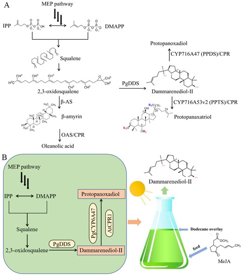 - Huang, Z.; Lin, J.; Cheng, Z.; Xu, M.; Huang, X.; Yang, Z.; Zheng, J. Production of dammarane-type sapogenins in rice by expressing the dammarenediol-II synthase gene from Panax ginseng C.A. Mey. Plant Sci. 2015, 239, 106–114. [Google Scholar] [CrossRef]