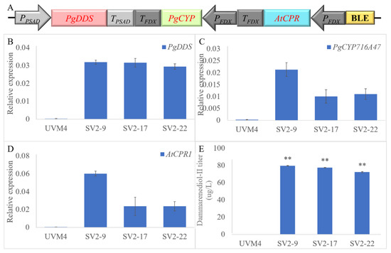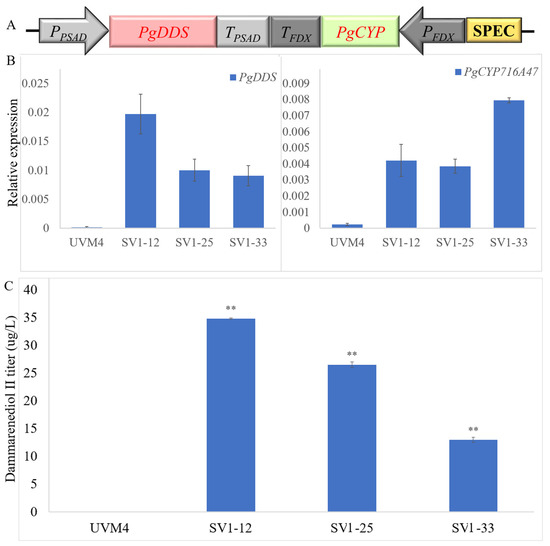 Overview of the expression and screening strategy for the transgenic C. reinhardtii. (A) Diagram of the codon-optimized PgDDS and PgCYP716A47 gene expression cassettes; (B) Real-time fluorescence quantitative PCR analysis of the expression of PgDDS and PgCYP716A47 in transgenic C. reinhardtii strains SV1. The qRT-PCR results were obtained from three independent biological replicates per sample. The levels of detected amplification were normalized via the amplified products of the actin genes as a reference. The error bars represent the standard errors. Statistical significance (one-way ANOVA) compared to UVM4 is represented by asterisks (** indicates a difference at the p ≤ 0.01 level); (C) Dammarenediol-II yield in transgenic algae.