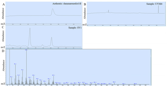 Identification of fermentation products of strain SV1-12. This strain was cultivated in a TAP medium. (A) GC-MS analysis of dammarenediol-II standard; (B) GC-MS analysis of cell extraction of the parent strain, UVM4; (C) GC-MS analysis of cell extraction of strain SV1; (D) mass spectra of dammarenediol-II.