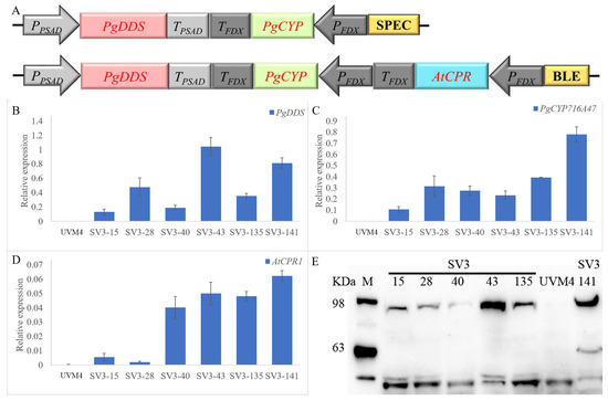 Overview of the expression and screening strategy for the transgenic C. reinhardtii. (A) Co-expression of V1 and V2 in C. reinhardtii. Real-time fluorescence quantitative PCR analysis of the expression of PgDDS (B), PgCYP716A47 (C), and AtCPR (D) in transgenic C. reinhardtii strains SV3. The qRT-PCR results were obtained from three independent biological replicates per sample. The levels of detected amplification were normalized via the amplified products of the actin genes as a reference. The error bars represent the standard errors. (E) Western blot of a total cellular protein with an α-StrepII tag antibody. SV3-43, SV3-135, and SV3-141 expressing strains exhibit signals at the appropriate predicted molecular mass. Full-length expression of each protein (PgDDS (~90 kDa) and PgCYP716A47 (~56 kDa)) could be detected. M: marker.