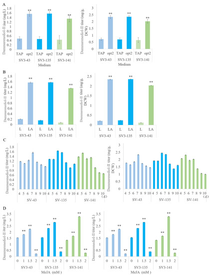 Dammarenediol-II yield in transgenic algae. (A) Strains were cultivated in 500 mL shake flasks containing a 300 mL TAP or opt2 medium at 25 °C and 120 rpm under 16:8 h light: dark (L:D) cycles (LA) condition, and using 5 mL dodecane as a solvent overlay for 7 d. (B) Strains were grown under constant (24 h) light (L) or 16:8 h L:D cycles (LA) conditions. Strains were cultivated in 500 mL shake flasks containing a 300 mL TAP medium at 25 °C and 120 rpm under constant (24 h) light or 16:8 h L:D cycles, and using 5 mL dodecane as an overlay for 7 d. (C) Strains were cultivated in 500 mL shake flasks containing a 300 mL TAP medium at 25 °C and 120 rpm under 16:8 h L:D conditions using 5 mL dodecane as an extraction overlay for 4, 5, 6, 7, 8, 9, or 10 d. (D) Strains were cultivated in 500 mL shake flasks containing a 300 mL TAP medium supplemented with 1, 1.5, or 2 mM MeJA at 25 °C and 120 rpm under 16:8 h L:D conditions, and using 5 mL dodecane as an extraction solvent for 7 d. Three biological replicates were used to calculate the dammarenediol-II yield averages and SDs. Statistical significance (one-way ANOVA) is represented by asterisks (** indicates a difference at the p ≤ 0.01 level).