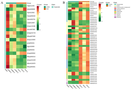 Based on fold change ≥ 2 or ≤0.5 and VIP ≥ 1, there were 19 and 46 significantly different metabolites, which were identified from UHPLC-MS/MS (4 upregulated, 15 down-regulated) and GC-MS (34 upregulated, 12 down-regulated), between SV3 (SV3-141) and UVM4, respectively (Figure 7 and Supplementary Tables S3 and S4). In particular, some of the significantly different metabolites, which belong to terpenoids, have medicinal properties.