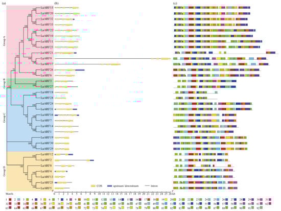Further, to assess the genetic relationships among the LuARFs, a phylogenetic tree was constructed using the LuARF protein sequences (Figure 1a). The analysis showed that the LuARFs could be divided into four groups (groups A to D) and most LuARF members existed in pairs. Further analysis of the gene structure by comparing the cDNA sequences with the genomic DNA sequences using Gene Structure Display Server (GSDS) revealed that the length of LuARF genes varied significantly, with LuARF9 being the longest (26.0 kb) and LuARF13 being the shortest (2.4 kb) (Figure 1b and Table 1) [42]. The ARF genes in Heiya-14 and pale flax were 1.4 to 14.6 kb and 2.2 to 14.6 kb long, respectively (Table S3). These observations indicated significant differences among the members of the same cultivar. The number of exons was also remarkably different (2 to 14 or 15) among the ARF genes in the three genomes. Twenty-two LuARF genes (66.7%) had ≥10 exons, while seven had 2–5 exons, and the other four had 8–9 exons. The number of exons in the ARF genes of Heiya-14 and pale flax was similar to that of Longya-10.