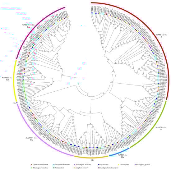 Phylogenetic tree of ARF proteins from flax, Arabidopsis, soybean, cotton, barrel medic, Egrandis, grape, rice, sorghum, and B. distachyon. All ARFs are divided into four main clades, and clades III and IV were further divided into three subgroups, each indicated by a different color. ARF proteins obtained from different species were marked by circles filled with different colors.