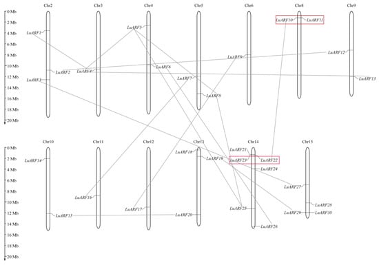 Chromosomal distribution of LuARF genes. Red rectangles and gray lines show the gene pairs underwent tandem and segmental duplication, respectively.