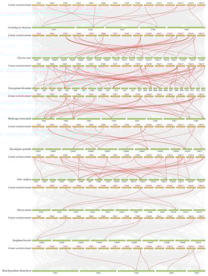 Collinearity analyses of ARF genes between flax and other nine species (Arabidopsis, soybean, cotton, barrel medic, Egrandis, grape, rice, sorghum, and B. distachyon). Gray lines indicate the syntenic blocks between flax and other plant genomes, whereas the red lines represent the collinear ARF gene pairs.