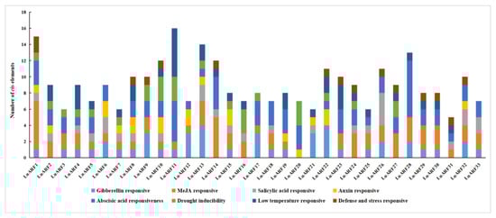 The cis-acting elements in the promoter regions are essential in regulating the transcription of genes. To determine the potential function of LuARF genes, the promoter sequences of all LuARFs were analyzed using the PlantCARE database [44]. The analysis revealed numerous light, phytohormone, and abiotic stress response elements on LuARF promoters and a few basic elements (TATA-box and CAAT-box) (Figure 5 and Table S7). Further analysis of the hormone- and stress-responsive elements identified five kinds of phytohormone-related elements, including those related to gibberellin (GARE-motif, TATC-box, and P-box), methyl jasmonate (MeJA, CGTCA-motif), salicylic acid (TCA-element and SARE), auxin (TGA-element, AuxRR-core, and TGA-box), and abscisic acid (ABRE). Among them, the gibberellin, MeJA, and abscisic acid-responsive elements were abundant in LuARF promoters (44, 63, and 68, respectively). The number of hormone response elements in each LuARF ranged from 4 to 12, implying an uneven distribution pattern. LuARF1, 2, 6, 8, 10, 13, and 32 had all five phytohormone-related elements, while LuARF20 and 27 contained only two types. LuARF13 and 22, LuARF1, and LuARF11 contained up to 4, 6, and 7 elements associated with gibberellin, MeJA, and abscisic acid, respectively. Additionally, three regulatory elements related to environmental stress, the MBS (drought inducibility), LTR (low temperature responsive), and TC-rich repeats (defense- and stress-responsive), were identified in the LuARF promoter; 17, 21, and 14 LuARF genes contained MBS, LTR, and TC-rich repeats, respectively. Among the 21 genes, LuARF11 had the most LTR elements.