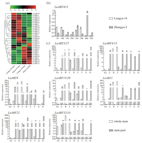 Expression patterns of LuARF genes in different tissues of flax. (a) Expression analysis of LuARFs in different tissues and varieties using transcriptome data. (b) Relative expression levels of LuARF4/13 in seeds of two flax varieties at different developmental stages. (c) Relative expression levels of LuARF genes in whole stem and stem peel. SA, A, to H represent the whole stem or the stem peel collected from 0 to 1 cm, 1 to 2 cm, 2 to 3 cm, 3 to 4 cm, 10 to 11 cm, 20 to 21 cm, 30 to 31 cm, 40 to 41 cm, and 50 to 51 cm of Longya-10 plants based on the fiber development stage, respectively. All the results were based on three biological replicates. Error bars indicate ±SD for three biological replicates.