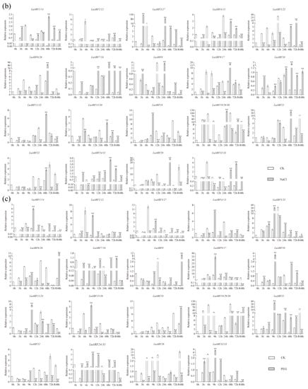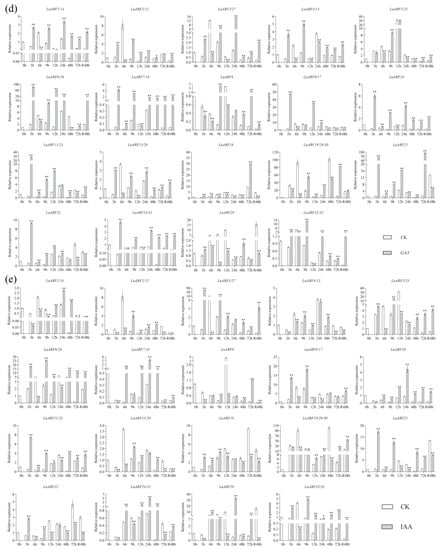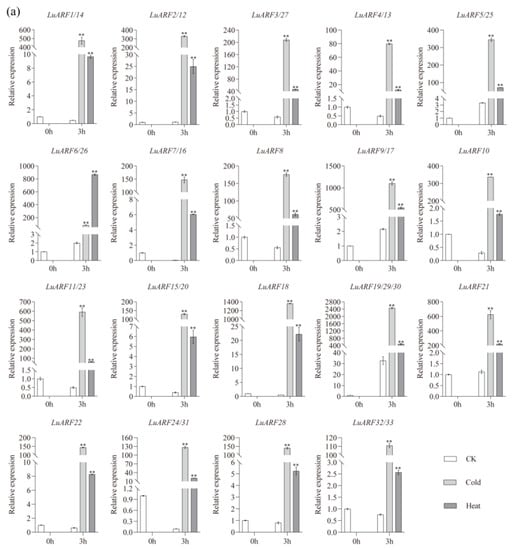 Then, to investigate the expression patterns of LuARF genes under various phytohormone and abiotic stress treatments, seeds of Longya-15 were allowed to germinate in Petri dishes at 25 °C under 16 h:8 h light/dark conditions in a climate chamber. After 10 days of growth, uniformly grown seedlings were selected, transferred to 1/2 MS liquid medium, and cultivated for 3 days under the same conditions. Then, the medium was replaced with fresh medium containing 150 mM NaCl and 20% PEG to induce salinity and drought treatment, respectively, and 15 µM indole-3-acetic acid (IAA) or 5 µM naphthalene acetic acid (NAA) or 5 µM gibberellic acid (GA3) for the phytohormone treatment. The seedlings were subjected to 42 °C and 4 °C to induce heat and cold stress, respectively. The plants used for treatments were all from a single sowing. For each treatment, three biological replicates were set up. The leaves were collected from seedlings under heat and cold stress after 3 h of exposure and from drought, salinity, and phytohormone treatment at 3, 6, 9, 12, 24, 48, and 72 h under stress and 48 h after subsequent growth in 1/2 MS liquid medium without supplement. The leaves from the control seedlings were collected at 0 h and all other time points. For each treatment, samples were collected from three plants per replicate at each time point. All samples were frozen in liquid nitrogen immediately after collection and stored at −80 °C for RNA extraction.