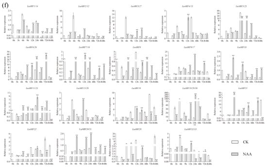 Finally, to assess the potential functions of LuARF genes in response to phytohormones and abiotic stresses, we investigated their expression levels in flax seedlings under IAA, NAA, and GA3 treatments and salinity, drought, cold, and heat stresses. The analysis showed that all LuARFs were significantly induced 4 h after exposure to cold and heat stress, and the response of all genes, except LuARF6/26, to cold stress was more pronounced than to heat stress (Figure 7a). Under salinity stress (NaCl), all genes were significantly induced at least at one time point after exposure. Most genes exhibited significantly higher expression than the control at 48–72 h after treatment, while LuARF8 showed higher expression at 9 and 24 h (Figure 7b). After PEG treatment, all LuARF genes exhibited an expression peak at 9 h, except for LuARF7/16, LuARF18, LuARF19/29, and LuARF28 (Figure 7c). Notably, the expression of LuARF18 and LuARF28 did not exceed that of the control at any point after PEG treatment. In addition, LuARF genes exhibited differential expression patterns under GA3 and IAA treatments (Figure 7d,e). Most genes were significantly upregulated at 3 or 9 h after GA3 and IAA treatments. LuARF7/16 expression after GA3 treatment was higher than the control at all time points except for 12 h, while LuARF10, LuARF11/23, and LuARF32/33 expression levels after IAA exposure were significantly higher than the control at up to six time points. Most LuARFs were highly induced at 12 or 24 h after NAA treatment; LuARF6/26, LuARF7/16, LuARF10, LuARF21, and LuARF24/31 were significantly induced at 12, 48, or 72 h, and another three time points (3, 6, 9, or 24 h) after exposure to NAA (Figure 7f). At 48 h recovery, different LuARFs exhibited different expression patterns under phytohormone and stress treatments; a few LuARFs showed higher expression than the control, while some members showed lower expression than the control.