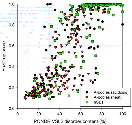 2.3. Global Analysis of LLPS Predisposition of Proteomes of A-Bodies and nSBs