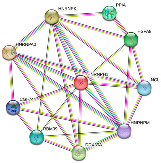 - Szklarczyk, D.; Franceschini, A.; Kuhn, M.; Simonovic, M.; Roth, A.; Minguez, P.; Doerks, T.; Stark, M.; Muller, J.; Bork, P.; et al. The STRING database in 2011: Functional interaction networks of proteins, globally integrated and scored. Nucleic Acids Res. 2011, 39, D561–D568. [Google Scholar] [CrossRef] [PubMed]