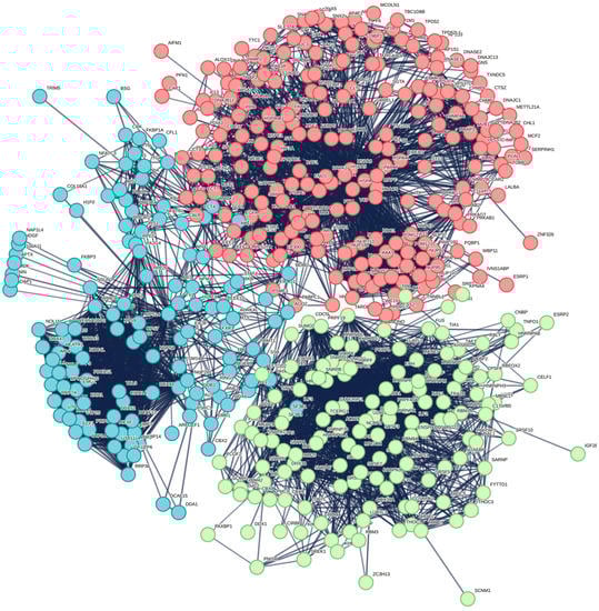 - Interactome analysis of proteins that are simultaneously included in all three studied proteomes using STRING database.