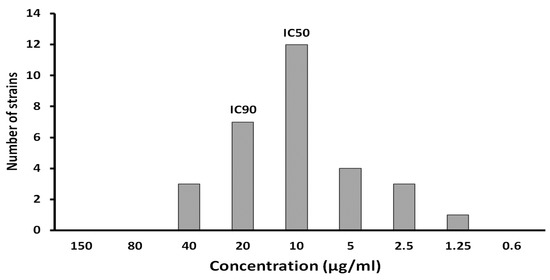 - Inoculation: the inoculation was performed with a multiple inoculator, and the plates were incubated for 48 h at 37 °C in a workstation containing a microaerobic atmosphere (5% O2, 10% CO2, 85% N2). Double replicate assays were carried out to ensure the reproducibility of results. The minimum inhibitory concentration (MIC) is determined as the lowest concentration of the bioactive agent which inhibits the growth of the H. pylori strain.