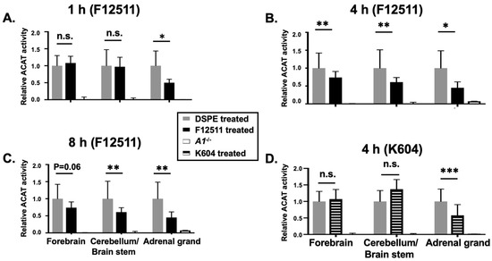IV injection of nanoparticle F reduces ACAT activities in both adrenal glands and brain, while nanoparticle K604 only reduces ACAT activity in adrenal glands but not in brain. WT mice were IV injected with either nanoparticle F with F12511 at low concentration (30 mM DSPE-PEG2000 with 5.8 mg F per kg mouse bodyweight) or with empty nanoparticle at zero time and sacrificed after (A) 1 h, (B) 4 h, or (C) 8 h. (D) WT mice were IV injected with nanoparticle K604, with K604 at high concentration (30 mM DSPE-PEG2000 with 24 mg K604 per kg) or with empty nanoparticle at zero time and sacrificed after 4 h. A1−/− refers to Acat1−/− mouse as a negative control. Relative ACAT activity was determined by using the ACAT enzyme assay as described in the methods. WT mice per group, at age 4–5 months with gender matched. N = 1 for A1−/− mouse. Two-way ANOVA was conducted for statistics. p < 0.001 ***; p < 0.01 **; p < 0.05 *; n.s., not significant.
