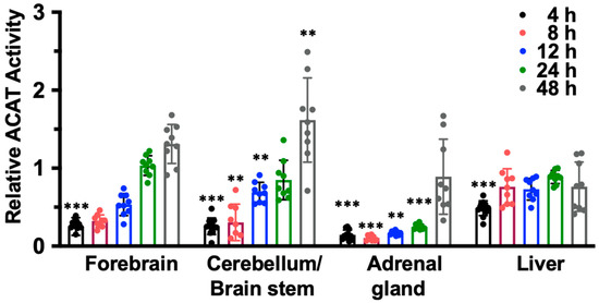To examine if IV injection of nanoparticle F causes the preferential accumulation of F12511 in adrenals or in any other tissues, we conducted mass analyses of nanoparticle F by using a LC/MS/MS-based procedure described in [54]. The results (Figure 2, top) showed that after a single IV injection of nanoparticle F at a high dose (46 mg F12511/kg), at 4 h, the F12511 content in the plasma reached values close to 30 µM. To compare this value with the values in the literature, it was previously known that F12511 can be solubilized at a high concentration by cyclodextrin. When mice were orally fed with an F12511/cyclodextrin complex, the maximal blood F12511 concentration that could be reached was only 0.75 µM (data retrieved from the Pierre Fabre patent US patent 5990173); i.e., a value 30-fold less than the method described here can achieve. The results in the bottom graph of Figure 2 showed that after a single IV of nanoparticle F, the F12511 content decreased rapidly in the plasma, adrenals, livers, and brains with time (from 4 to 24 h); these results, which were collected via mass spectrometry analyses, indicated that there was no evidence for the preferential accumulation of F12511 in the adrenals. We also monitored the ACAT enzyme activities in various tissues 4 to 48 h after a single IV injection of nanoparticle F at 46 mg/kg. The results (Figure 3) showed that similar to the F12511 tissue content analyses results (Figure 2, bottom), the ACAT enzyme activity in various tissues (including the adrenal glands) steadily returned to near-normal levels within 24 to 48 h, demonstrating that there is no evidence to suggest the prolonged, preferential accumulation of F12511 in the adrenals.