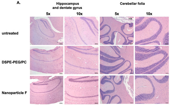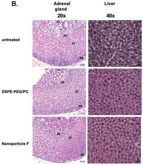 Treating normal mice with nanoparticle F or nanoparticles alone produces no overt morphological alterations in central nervous and peripheral tissues. Representative images from WT mice (n = 3–4/group) either untreated or treated with IV injections once per day with DSPE-PEG2000/PC or with nanoparticle F for 7 days. Tissues were collected 48 h after the last injection. (A) Images show hippocampus and dentate gyrus regions (left panels). Images on the right panels show cerebellar folia region. (B) Images show adrenal glands (left panels), and livers (right panels). For adrenal gland images, symbols used: m = medulla; ZR = zona reticularis; ZF = zona fasciculata; ZG = zona glomerulosa. Scale bars: 200 pixels: ~109 µm for 10× enlargement and ~54 µm for 20× enlargement. Scale bar: 200 pixels.