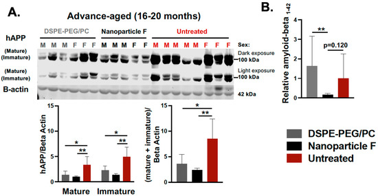 We had previously shown that Acat1/Soat1 gene knock out (KO) in the 3xTg AD mouse model [61] reduced the mutant full-length hAPP, suppressed the level of Aβ [27], and diminished the levels of unphosphorylated mutant human Tau, but did not hyperphosphorylate the mutant human Tau (HPTau) [32]. Here we tested the therapeutic efficacy of nanoparticle F in the 3xTg AD mouse model. In this model, Aβ, tau phosphorylation, and neuroinflammation become pronounced between 12–20 months of age [62]. We tested nanoparticle F in mice with an advanced age (16–20 months). Male and female mice were left untreated or were treated with daily IV injections (we alternated between the tail vein and retro-orbital venous sinus; 200 µL per injection) of nanoparticle F (~46 mg/kg F12511) or DSPE-PEG2000/PC (nanoparticle alone) for 2 weeks. After the treatment, the mouse tissues were collected and snap frozen until they were ready for tissue homogenization, Western blot analyses, ELISA, and a Luminex assay. The results showed that nanoparticle F significantly reduced the mutant hAPP as determined with the Western blot (Figure 6A) and reduced the total acid extractable Aβ1-42 as determined with the ELISA assay (Figure 6B). Interestingly and unexpectedly, the nanoparticles alone also reduced the full-length hAPP, although the effect was milder than that of the nanoparticles with F12511 (Figure 6A), suggesting that the nanoparticles without F12511 may exert a certain suppressive effect on the full-length hAPP. We noted that, in Figure 6, there was a large variability in the expression levels of the mutant hAPP and the Aβ1-42 levels among the nanoparticle-alone/vehicle (DSPE-PEG/PC)-treated and the untreated groups. We suspect that the variability might have been caused by the variability in the ages of these mice used (16–20 months of age).
