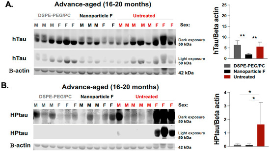 Besides the amyloid deposition, the 3xTg AD mice also developed tau pathologies. We measured changes in tau by performing Western blots by using two antibodies: HT7 (which recognizes the total human tau, hTau) and AT8 (which recognizes the human tau phosphorylated at Ser202/Thr205). The results showed that when compared with the untreated mice, only nanoparticle F, but not the nanoparticles alone, significantly reduced the total human tau levels (Figure 7A). Interestingly and unexpectedly, both nanoparticle F and the nanoparticles alone significantly reduced the phosphorylated tau HPTau levels (Figure 7B). These results again suggest that the nanoparticles alone may exert a certain suppressive effect on HPTau levels.