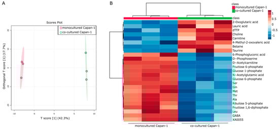 Intracellular metabolic reprogramming in PDAC cells co-cultured with CAF precursors. (A) Global trend of intracellular metabolite changes in cancer cells (Capan−1 cells). A supervised multivariate analysis, orthogonal-partial-least-squares-discriminant analysis (OPLS-DA), was performed using metabolomic datasets with Metaboanalyst 5.0 (https://www.metaboanalyst.ca/ (accessed on 21 April 2023)). The OPLS-DA score plot shows two groups of samples (n = 3 samples per group) based on the metabolomic datasets, with monocultured Capan−1 cells plotted in red and co-cultured Capan−1 cells in green. The model consists of one predictive x-score component: component t[1] and one orthogonal x-score component to[1]. The predictive variation in x (t[1]) represents the variation in the data that is correlated with the response variable, in this case, the difference between monocultured and co-cultured cells. This component accounts for 42.3% of the total variation. On the other hand, the orthogonal variation in x (to[1]) refers to the variation in the data that is not related to the response variable. Essentially, it captures the ‘noise’ or ‘unrelated variation’ in the data. In our model, it accounts for 17.7% of the total variation. (B) Heatmap comparing altered metabolites between monocultured Capan−1 cells (n = 3) and co-cultured Capan−1 cells (n = 3).