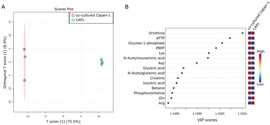 Intracellular metabolic differences in co-cultured Capan−1 Cells and CAFs. (A) Metabolites differentially detected in cells co-cultured with Capan−1 cells and CAFs. OPLS-DA was performed using metabolomic datasets with Metaboanalyst 5.0. The OPLS-DA score plot shows two groups of samples (n = 3 samples per group) based on the metabolomic datasets, co-cultured Capan−1 cells were plotted in red and co-cultured CAFs in green. The model consists of one predictive x-score component: component t[1] and one orthogonal x-score component to[1]. t[1] explains 75.5% of the predictive variation in x, to[1] explains 8.4% of the orthogonal variation in x. (B) A VIP plot corresponding to the score plot of OPLS-DA visualized the metabolite markers that importantly contributed to the discrimination.