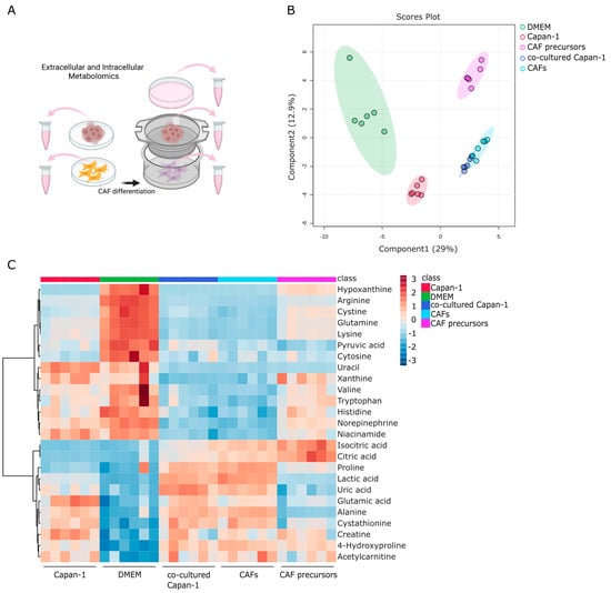 Identifying secreted and consumed metabolites in mono- and co-cultures of PDAC, CAF Precursors, and CAFs. (A) Global trend of extracellular metabolite changes in supernatant from Capan−1 cells, CAF precursors, and co-cultured cells. Schematic illustration of the extracellular metabolomic analysis to measure the metabolites in the culture medium. Supernatants were isolated from monoculture conditions or co-culture using a Transwell culture insert. (B) Principal component analysis (PCA) of extracellular metabolomic datasets of Capan−1 cells, CAF precursors, and mixed cells grown in each sole culture dish or a Transwell co-culture. (C) Heatmap comparing altered metabolites between supernatant from Capan−1 cells (n = 6), iCAF precursors (n = 6), co-cultured Capan−1 cells (n = 6), CAFs (n = 6), and DMEM (n = 6) as a baseline.