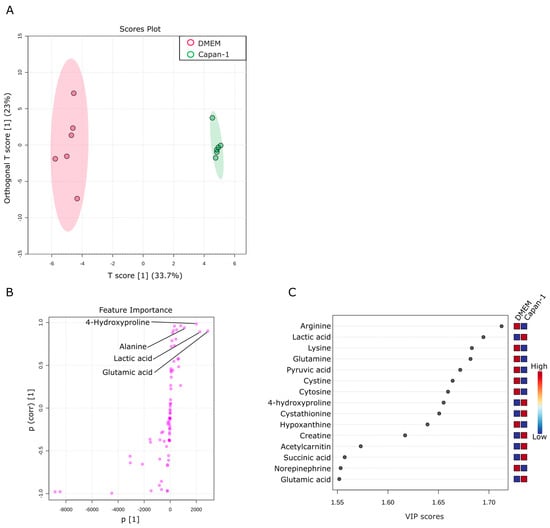 Metabolic alterations in water-soluble metabolites of Capan−1 cancer cell culture supernatant. (A) Metabolites specifically detected in the supernatants from sole Capan−1 cell culture. A supervised multivariate analysis, OPLS-DA, was performed. The OPLS-DA score plot shows two groups of samples (n = 6 samples per group) based on the metabolomic datasets; control DMEM media samples were plotted in red, and Capan−1 cell supernatants in green. The model consists of one predictive x-score component: component t[1] and one orthogonal x-score component to[1]. t[1] explains 33.7% of the predictive variation in x, and to[1] explains 23% of the orthogonal variation in x. (B) An S-shape plot corresponding to the score plot of OPLS-DA visualized the metabolite markers that contributed to the discrimination. (C) A VIP plot corresponding to the score plot of OPLS-DA visualized the metabolite markers that importantly contributed to the discrimination.