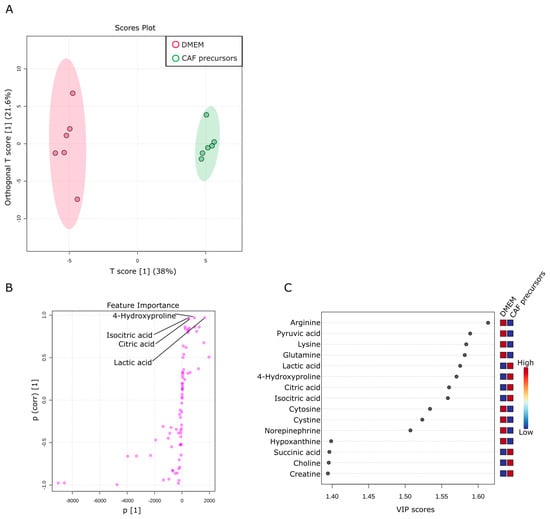 Metabolic activity of CAF precursors. (A) Metabolites specifically detected in the supernatants from sole CAF precursors culture. The OPLS-DA score plot shows two groups of samples (n = 6 samples per group) based on the metabolomic datasets; control DMEM media samples were plotted in red, and CAF precursors supernatants in green. The model consists of one predictive x-score component: component t[1] and one orthogonal x-score component to[1]. t[1] explains 38% of the predictive variation in x, to[1] explains 21.6% of the orthogonal variation in x. (B) An S-shape plot corresponding to the score plot of OPLS-DA visualized the metabolite markers that contributed to the discrimination. (C) A VIP plot corresponding to the score plot of OPLS-DA visualized the metabolite markers that importantly contributed to the discrimination.