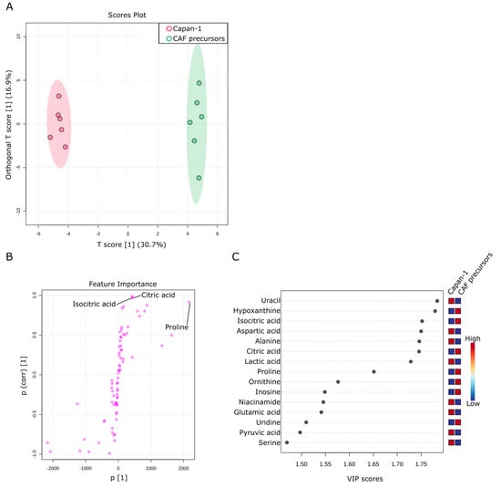 Comparison of metabolites in culture supernatants of Capan−1 and CAF precursors. (A) Metabolites differentially detected in the supernatants from sole Capan−1 cells and CAF precursors culture. OPLS-DA was performed using metabolomic datasets with Metaboanalyst 5.0. The OPLS-DA score plot shows two groups of samples (n = 6 samples per group) based on the metabolomic datasets: the supernatant of Capan−1 cells was plotted in red, and the supernatant of CAF precursors was plotted in green. The model consists of one predictive x-score component: component t[1] and one orthogonal x-score component to[1]. t[1] explains 30.7% of the predictive variation in x, and to[1] explains 16.9% of the orthogonal variation in x. (B) An S-shape plot corresponding to the score plot of OPLS-DA visualized the metabolite markers that contributed to the discrimination. (C) A VIP plot corresponding to the score plot of OPLS-DA visualized the metabolite markers that importantly contributed to the discrimination.