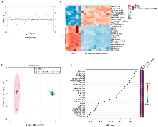 Metabolic changes in co-culture of Capan−1 and CAFs. (A) Metabolites differentially detected in the supernatants from co-cultured cells. Fold change analysis of metabolomic datasets of supernatants from co-cultured Capan−1 cells and CAFs. (B) Metabolites differentially detected in the supernatant of co-cultured and DMEM. The OPLS-DA score plot shows two groups of samples (DMEM media; n = 6, co-cultured supernatants; n = 12) based on the metabolomic datasets; control DMEM media samples were plotted in red, and co-cultured supernatant in green. The model consists of one predictive x-score component: component t[1] and one orthogonal x-score component to[1]. t[1] explains 42.5% of the predictive variation in x, and to[1] explains 19% of the orthogonal variation in x. (C) Heatmap comparing altered metabolites between DMEM media and co-cultured supernatants from the upper and lower part of the Transwell dish. (D) A VIP plot corresponding to the score plot of OPLS-DA visualized the metabolite markers that importantly contributed to the discrimination between DMEM media and co-cultured supernatants.