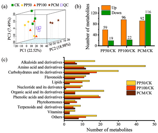The PCA score plot based on metabolomic data (a), total number (b), and classification (c) of DAMs in E. purpurea leaves upon PAH exposure. QC, quality control samples. Abbreviations of groups are indicated in Figure 1.