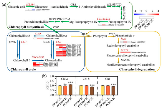 According to GO enrichment analysis, a total of 8 enriched terms in biological process (BP) and 5 enriched terms in molecular function (MF), including 4 sub-categories, namely, “chlorophyll catabolic process”, “pigment catabolic process”, “porphyrin-containing compound catabolic process”, and “tetrapyrrole catabolic process”, were shared between PP100/CK and PCM/CK groups (Figure S2 and Table S3). Totally, 17 genes encoding seven enzymes involved in the chlorophyll metabolic pathway were annotated (Figure 4a). Among these, 1, 3, and 9 genes encoding enzymes related to the chlorophyll cycle, namely, chlorophyllide a oxygenase (CAO), Chl b reductase (non-yellow coloring, NYC1/NOL), and chlorophyllase (CLH), were identified, and most of them were up-regulated under PAH exposure. In addition, the amount of Chla increased, and that of Chlb decreased in PCM, which indicated the enhanced interconversion between Chla and Chlb under complex PAH exposure (Figure 4b). The up-regulated expression of two genes associated with chlorophyll degradation, including Cluster-16663.37827, which encodes pheophorbide a oxidase (PAO) and Cluster-16663.69223, which encodes red Chl catabolite reductase (RCCR), was associated with low Chl level in the PCM leaves (Figure 4b).